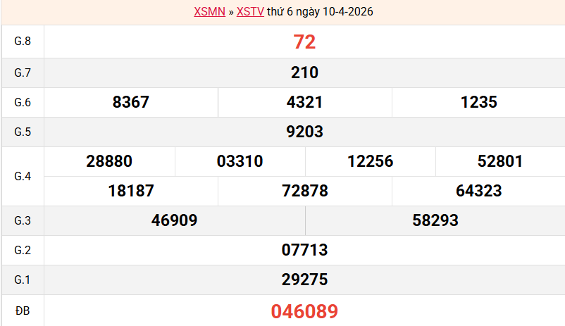 Mời các bạn xem lại bảng kết quả kỳ trước với giải đặc biệt, giải tám, lô tô 2 số để có thể đưa ra nhận định dự đoán TV ngày 17/04/2026 chuẩn xác nhất.