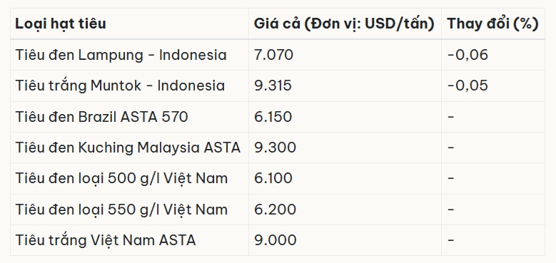 Giá tiêu đen Lampung của Indonesia hiện ở mức khoảng 7.070 USD/tấn, giảm nhẹ so với ngày trước đó. Trong khi đó, tiêu đen Brazil ASTA 570 được giao dịch quanh 6.150 USD/tấn và tiêu đen Malaysia ASTA đạt khoảng 9.300 USD/tấn.