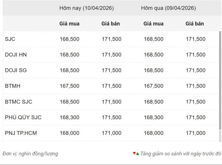Theo dữ liệu mới nhất, giá vàng trong nước được nhiều doanh nghiệp kinh doanh vàng bạc, đá quý niêm yết đồng loạt trong sáng 10/4. Cụ thể, vàng SJC tại Hà Nội và Đà Nẵng đang được giao dịch ở mức 168,5 triệu đồng/lượng mua vào và 171,5 triệu đồng/lượng bán ra. Tại TP.HCM, giá vàng SJC cũng giữ nguyên mức tương tự hai khu vực trên. So với phiên liền trước, giá vàng đã giảm 2,5 triệu đồng/lượng ở chiều mua vào và 3,5 triệu đồng/lượng ở chiều bán ra.