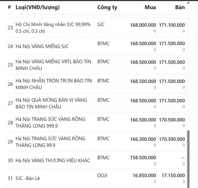 Tương tự, giá vàng DOJI tại Hà Nội được niêm yết ở mức 168,5 triệu đồng/lượng mua vào và 171,5 triệu đồng/lượng bán ra, cùng mức giảm lần lượt 2,5 triệu đồng/lượng và 3,5 triệu đồng/lượng so với trước đó. Tại TP.HCM, giá DOJI không có sự chênh lệch so với Hà Nội.