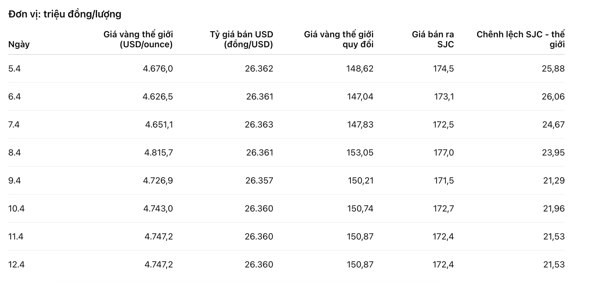 Tính theo tỷ giá USD/VND, giá vàng thế giới quy đổi tăng hơn 2,2 triệu đồng/lượng, trái ngược với xu hướng giảm của vàng trong nước. Vì vậy, khoảng cách giữa hai thị trường cũng thu hẹp từ gần 26 triệu đồng xuống còn hơn 21 triệu đồng mỗi lượng.