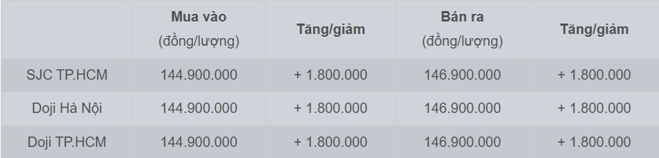 Mở cửa phiên giao dịch 29/10, giá vàng miếng SJC được điều chỉnh tăng tới 1,8 triệu đồng/lượng ở cả chiều mua vào và bán ra so với mức chốt hôm qua, lên mức 144,9-146,9 triệu đồng/lượng (mua - bán).