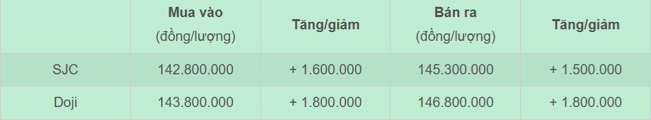 Doji công bố giá vàng nhẫn 9999 ở mức 142-145 triệu đồng/lượng (mua - bán), giảm 3,8 triệu đồng ở cả 2 chiều. Bảo Tín Minh Châu niêm yết giá vàng nhẫn bán ra ở mức 147,8 triệu đồng/lượng.