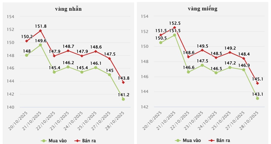 Cuối phiên giao dịch ngày 28/10, giá vàng miếng 9999 tại SJC được niêm yết ở mức 143,1-145,1 triệu đồng/lượng (mua vào - bán ra), giảm 3,8 triệu đồng chiều mua vào và giảm 3,3 triệu đồng chiều bán ra so với phiên liền trước.