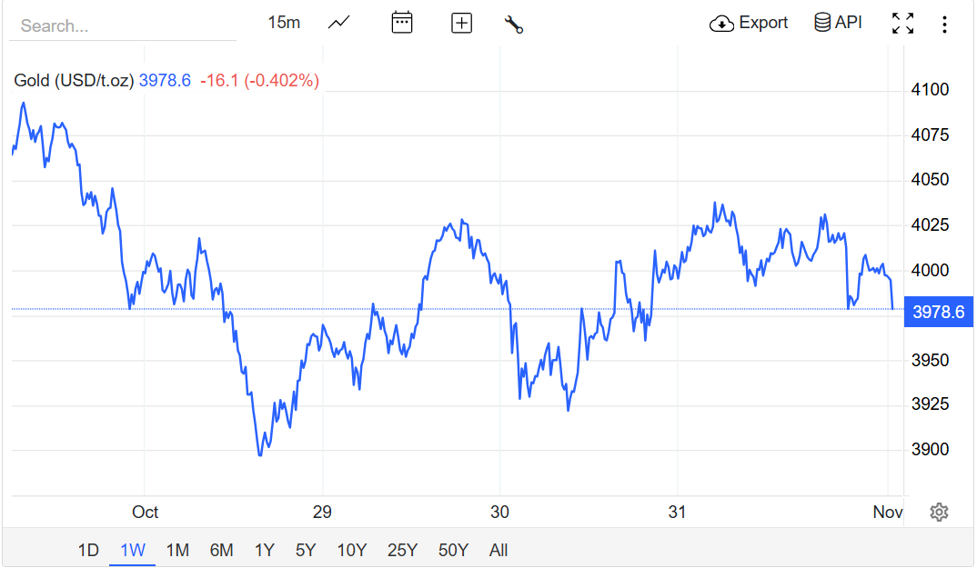 Theo Kitco News, thị trường vàng đã kết thúc 2 tuần trong vùng tiêu cực khi giá dao động quanh mức 4.000 USD/ounce. Giới chuyên gia nhận định, mặc dù không thể loại trừ khả năng giá thấp hơn trong thời gian tới, nhưng thị trường dường như cảm thấy thoải mái ở mức cao này, sự thoái lui không làm giảm sự lạc quan dài hạn.
