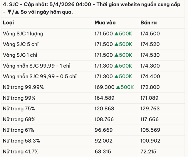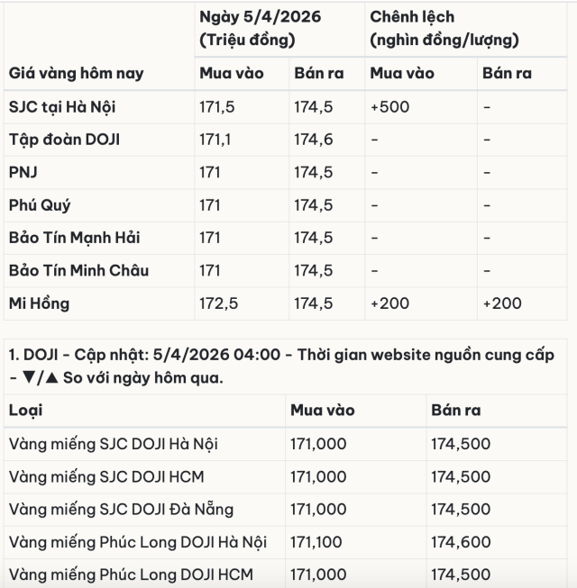 Theo cập nhật lúc 4h00 ngày 5/4/2026, mặt bằng giá vàng SJC tại các doanh nghiệp lớn cơ bản ổn định so với chốt phiên ngày 4/4. Công ty SJC niêm yết giá mua vào ở mức 171,5 triệu đồng/lượng và bán ra 174,5 triệu đồng/lượng, chênh lệch mua – bán duy trì khoảng 3 triệu đồng/lượng. So với tuần trước, giá vàng SJC đã tăng khoảng 1,7 triệu đồng/lượng ở cả hai chiều.