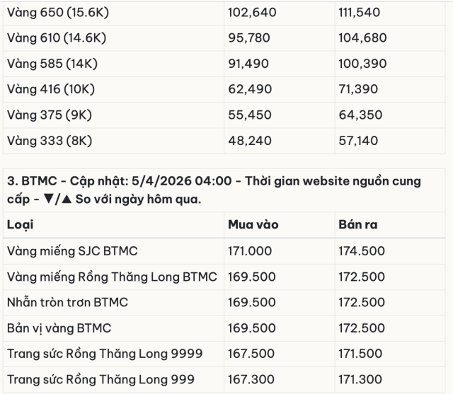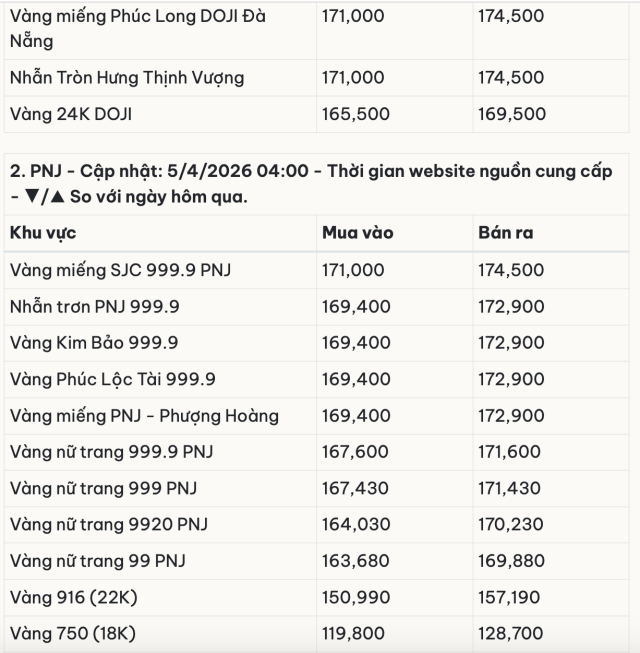 Bảng giá vàng hôm nay 5/4/2026 mới nhất như sau: