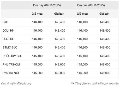 Cụ thể, tại thời điểm 10 giờ ngày 9/11, Công ty Vàng bạc đá quý Sài Gòn (SJC) niêm yết giá vàng miếng SJC mua vào-bán ra ở mức 146,4-148,4 triệu đồng/lượng. Chênh lệch mua-bán 2 triệu đồng/lượng.