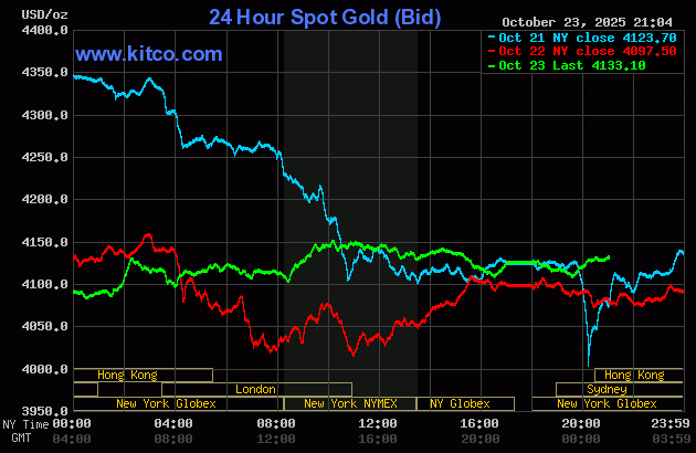 Tính đến 8 giờ 30 phút ngày 24/10 (giờ Việt Nam), giá vàng thế giới tăng 35,6 USD so chốt phiên trước đó lên mức 4.133,1 USD/ounce.