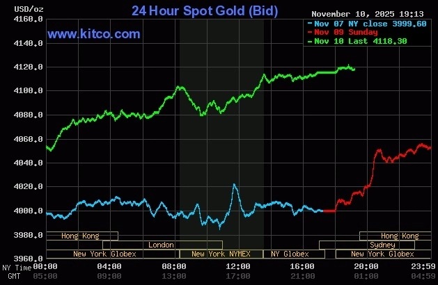 Chốt phiên giao dịch 10/11, giá vàng thế giới giao ngay tăng 115 USD lên 4.114 USD một ounce. Sáng 11/11, giá tiếp tục nhích lên 4.116 USD.