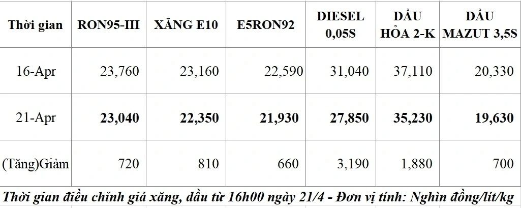 Tại Việt Nam, giá xăng dầu được điều chỉnh giảm từ 16h ngày 21/4 theo quyết định của liên Bộ Công Thương – Tài chính.