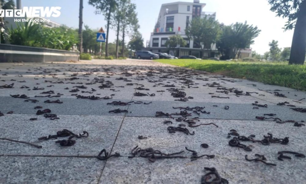 Giun đất bò lên phần vỉa hè bao quanh khu đất dày đặc. Phần lớn số giun đất này đã chết khô.