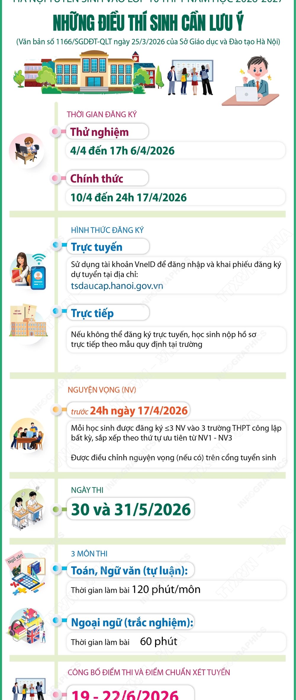 Theo đó, mỗi học sinh được đăng ký tối đa 3 nguyện vọng vào các trường công lập không chuyên bất kỳ; học sinh sử dụng tài khoản định danh điện tử VneID để đăng nhập và khai phiếu đăng ký dự tuyển tại Cổng tuyển sinh đầu cấp của thành phố, địa chỉ: tsdaucap.hanoi.gov.vn. Thời gian đăng ký được chia làm hai giai đoạn. Giai đoạn thử nghiệm diễn ra từ ngày 4/4 đến 17h ngày 6/4 nhằm giúp học sinh làm quen với hệ thống. Giai đoạn đăng ký chính thức từ ngày 10/4 đến 24h ngày 17/4. Thí sinh được điều chỉnh nguyện vọng (nếu có) trên cổng tuyển sinh trước 24h ngày 17/4. Sau thời điểm này, học sinh không được thay đổi nguyện vọng đã đăng ký... Đây là một số điểm thí sinh cần lưu ý trong tuyển sinh lớp 10 năm học 2026-2027 của Hà Nội.