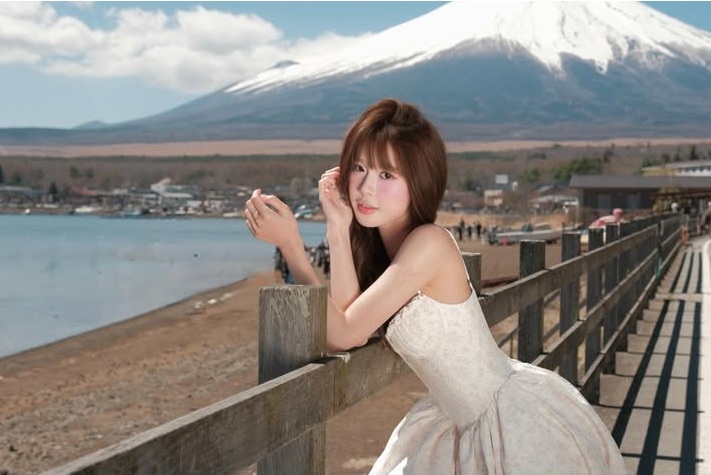 Mái tóc buông tự nhiên, ánh mắt trong veo cùng cách tạo dáng mềm mại khiến tổng thể khung hình trở nên rất “thơ”. Bên cạnh đó, sự xuất hiện của chú thiên nga trắng bơi gần bờ càng làm tăng thêm cảm giác lãng mạn và huyền ảo cho bộ ảnh.