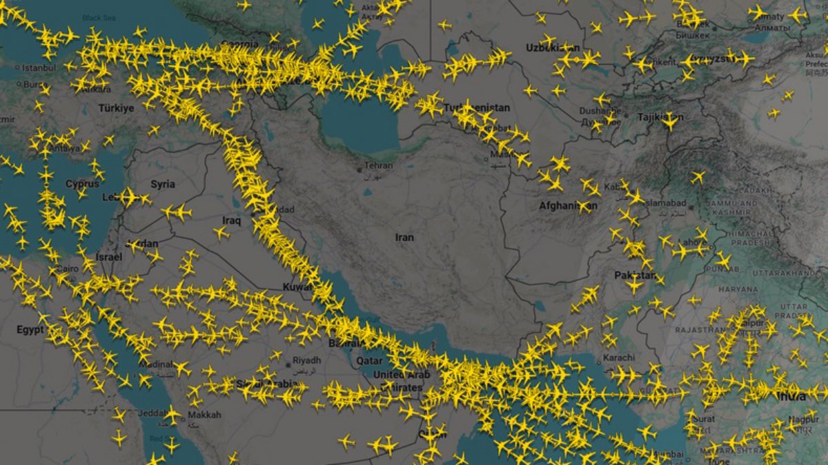 Các chuyến bay dường như đang bay vòng qua biên giới Iran sau khi nước này đóng cửa không phận hôm nay. Ảnh: Flightradar24