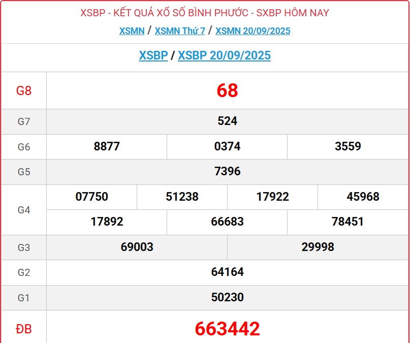 XSBP 20/9. Kết quả xổ số Bình Phước hôm nay ngày 20/9/2025 sẽ được cập nhật nhanh chóng và chính xác nhất. Kết quả các giải thưởng XSBP 20/9/2025 được công bố lần lượt từ giải nhất cho đến giải tám, cuối cùng là giải đặc biệt.