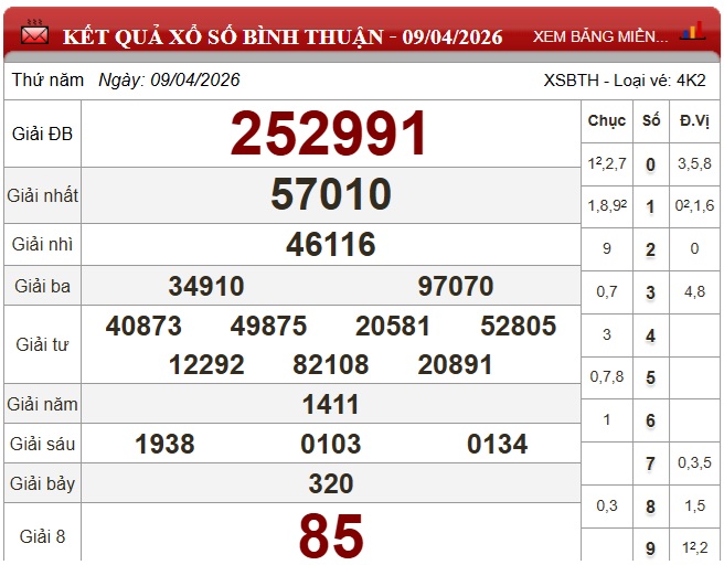 Kết quả xổ số Bình Thuận Thứ Năm ngày 9/4/2026