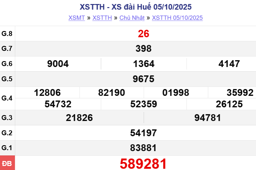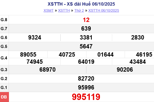 Theo dõi kết quả xổ số Huế hôm nay 12/10/2025 để cập nhật kết quả sớm nhất.