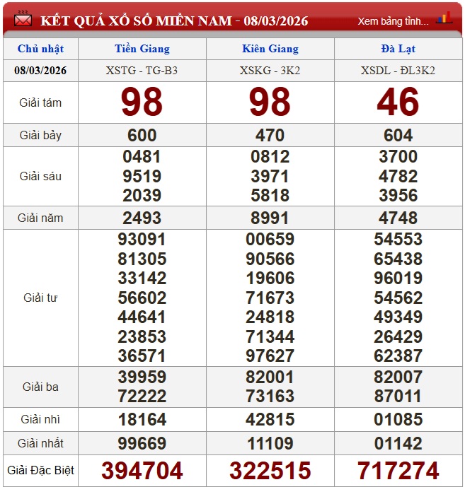 Đầu tiên, xổ số miền Nam hôm nay Chủ nhật ngày 8/3/2026 có kết quả như sau:
