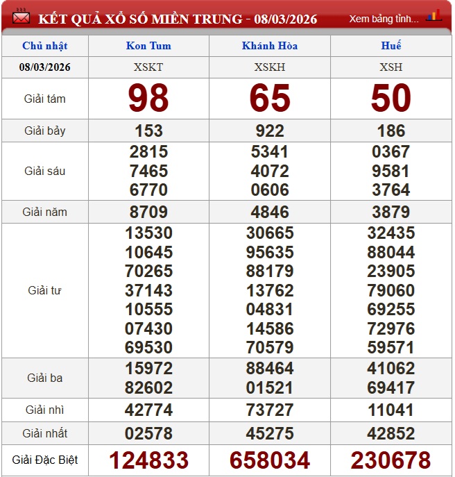 Tiếp theo, xổ số miền Trung hôm nay Chủ nhật ngày 8/3/2026 có kết quả như sau:
