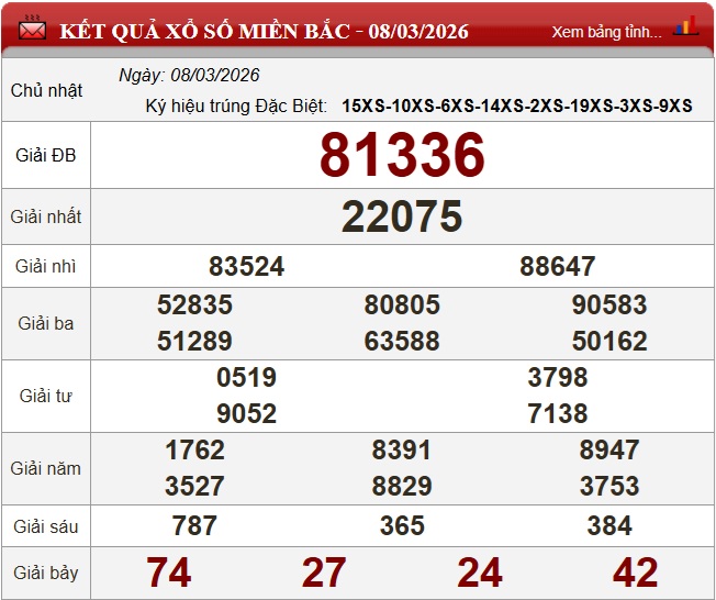 Cuối cùng, xổ số miền Bắc hôm nay Chủ nhật ngày 8/3/2026 có kết quả như sau: