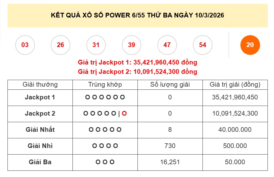 Kết quả xổ số Power 6/55 THỨ BA NGÀY 10/3/2026