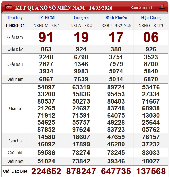 Đầu tiên, xổ số miền Nam hôm nay thứ Bảy ngày 14/3/2026 có kết quả như sau: