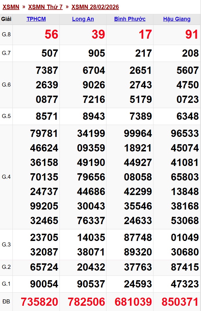 Đầu tiên, xổ số miền Nam hôm nay thứ Bảy ngày 28/2/2026 có kết quả như sau: