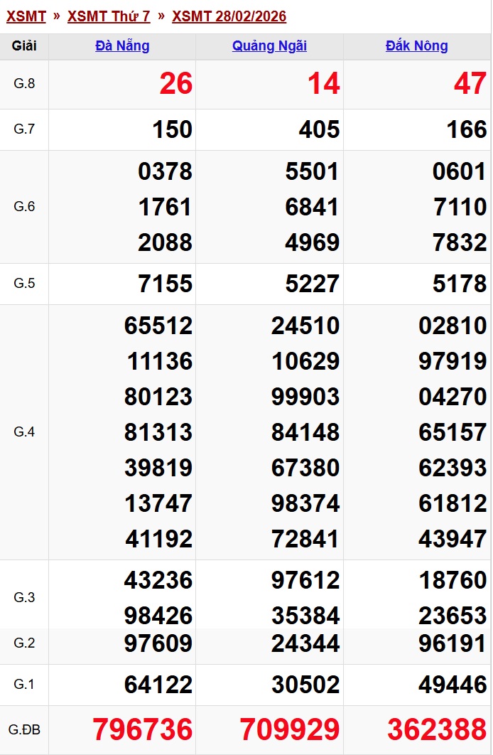 Tiếp theo, xổ số miền Trung hôm nay thứ Bảy ngày 28/2/2026 có kết quả như sau: