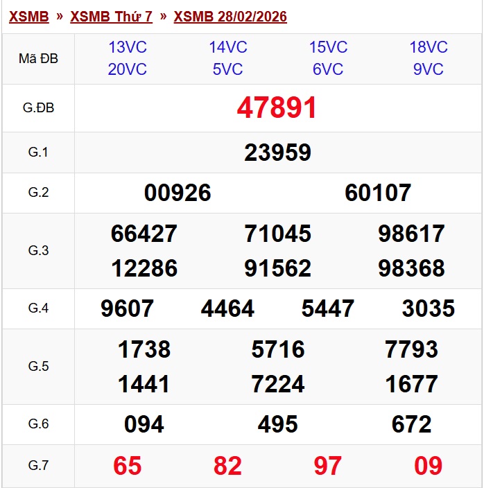 Cuối cùng, xổ số miền Bắc hôm nay thứ Bảy ngày 28/2/2026 có kết quả như sau: