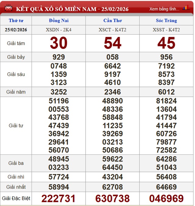 Kết quả xổ số hôm nay - KQXS thứ Tư ngày 25/2/2026: Xổ số miền Nam - XSMN, xổ số miền Trung - XSMT, xổ số miền Bắc - XSMB, xổ số Vietlott - XS Vietlott.