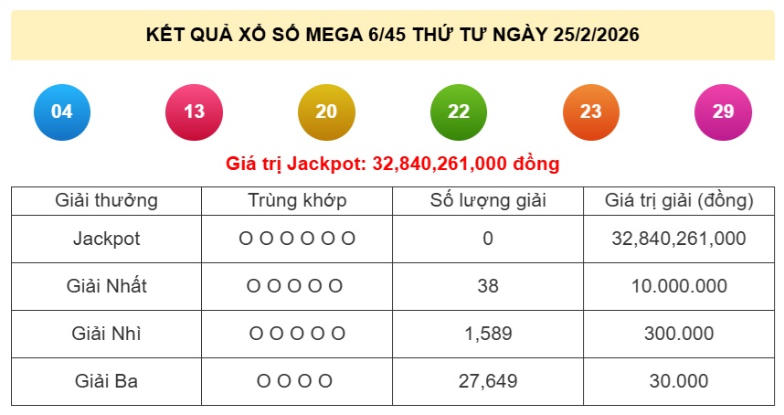 Kết quả xổ số Mega 6/45 thứ tư ngày 25/2/2026