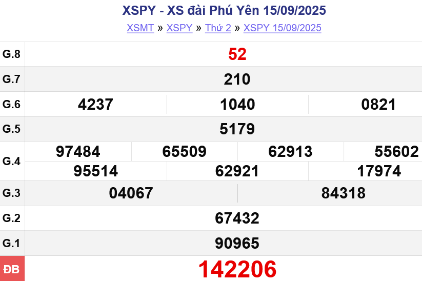 XSPY 15/9. Kết quả xổ số Phú Yên hôm nay ngày 15/9/2025 được quay thưởng vào lúc 17h15 bởi Công ty TNHH MTV Xổ số kiến thiết Phú Yên. Kết quả các giải thưởng của XSPY 15/9/2025 được công bố lần lượt từ giải giải nhất cho đến giải tám, cuối cùng là giải đặc biệt.