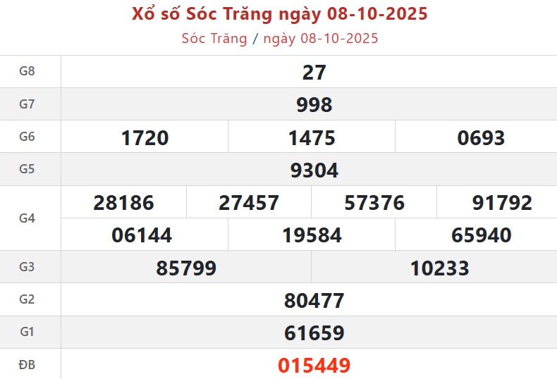 Theo dõi kết quả xổ số Sóc Trăng hôm nay 8/10/2025 nhanh chóng và chính xác nhất.
