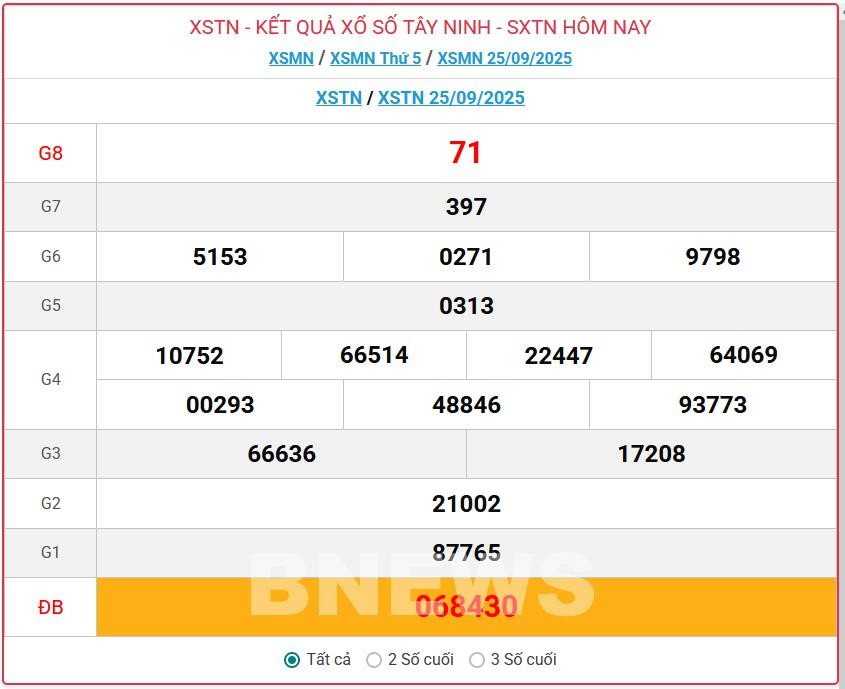 - XSTN 25/9, kết quả xổ số Tây Ninh ngày 25/9/2025