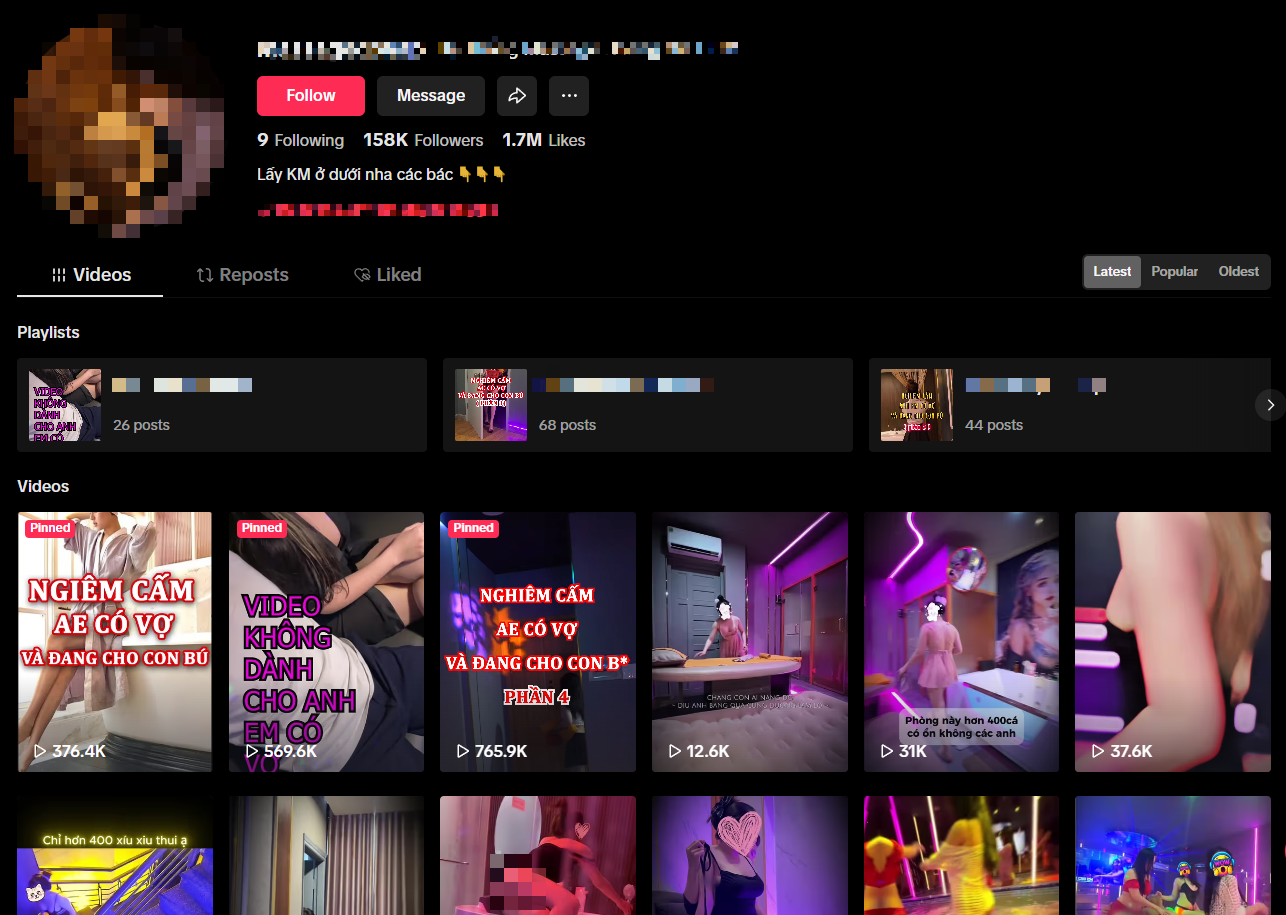 Điển hình như mới đây, kênh TikTok tên M* là một ví dụ điển hình. Kênh này chuyên về dịch vụ massage, sở hữu hơn 150.000 người theo dõi. Thay vì quảng bá dịch vụ một cách lành mạnh, kênh này lại thường xuyên đăng tải những video nhạy cảm, với nội dung 18+, trá hình để "câu khách", thu hút lượt xem và tương tác.