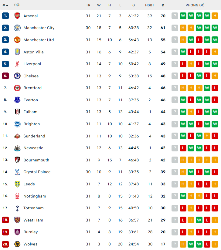 Vòng 32 Ngoại hạng Anh hứa hẹn sẽ là bước ngoặt quan trọng ở cả hai đầu bảng xếp hạng, khi cuộc đua vô địch lẫn trụ hạng đều bước vào giai đoạn căng thẳng nhất. Arsenal hiện dẫn đầu với 70 điểm sau 31 trận, tạo khoảng cách 9 điểm so với Manchester City nhưng đã chơi nhiều hơn một trận. Điều đó đồng nghĩa sức ép vẫn đang đè nặng lên thầy trò Mikel Arteta, nhất là khi Man City vẫn nổi tiếng với khả năng bứt tốc ở giai đoạn cuối mùa.