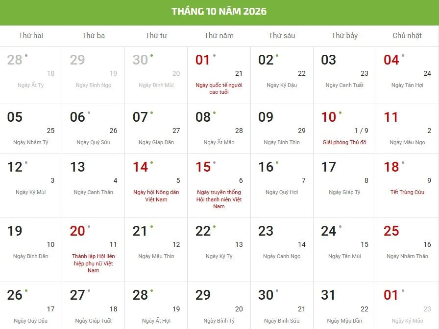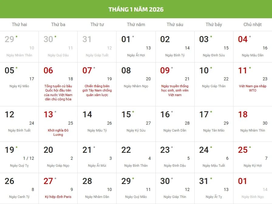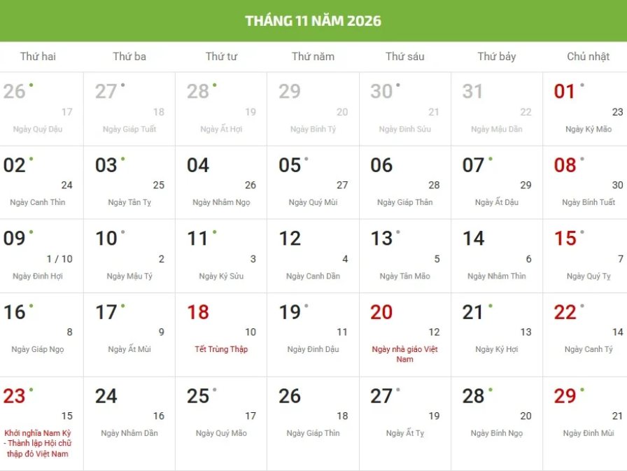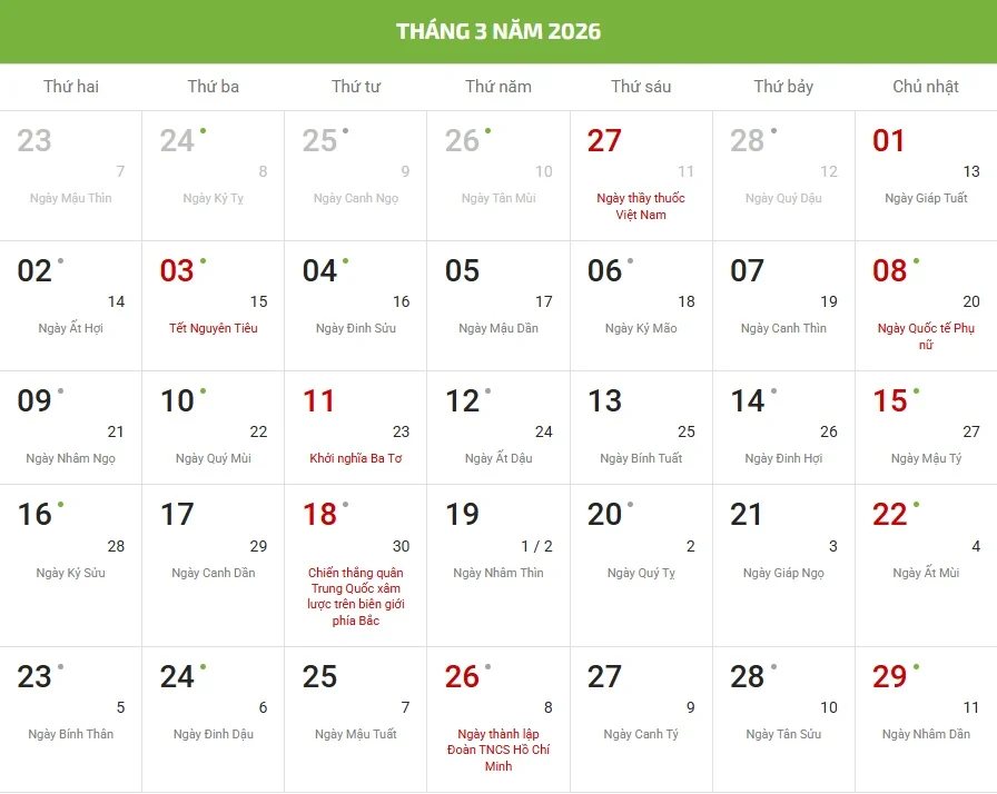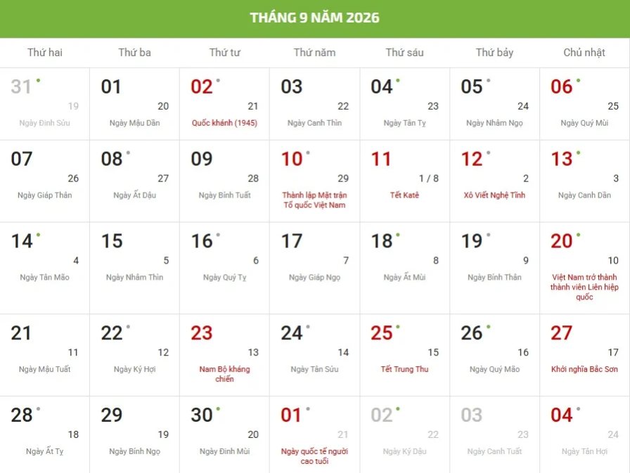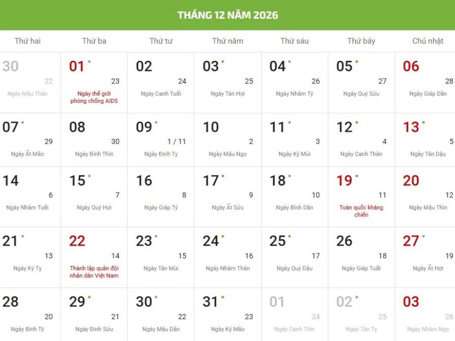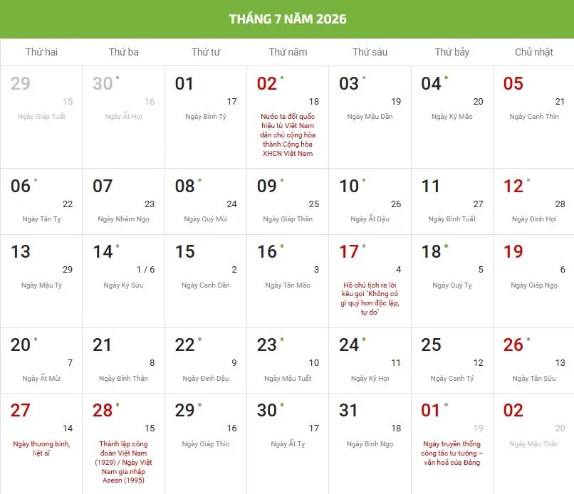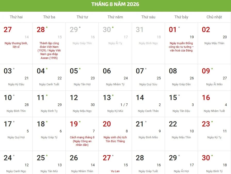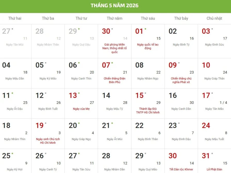 - Chữ/số màu đỏ là ngày lễ, sự kiện hoặc ngày Chủ nhật.