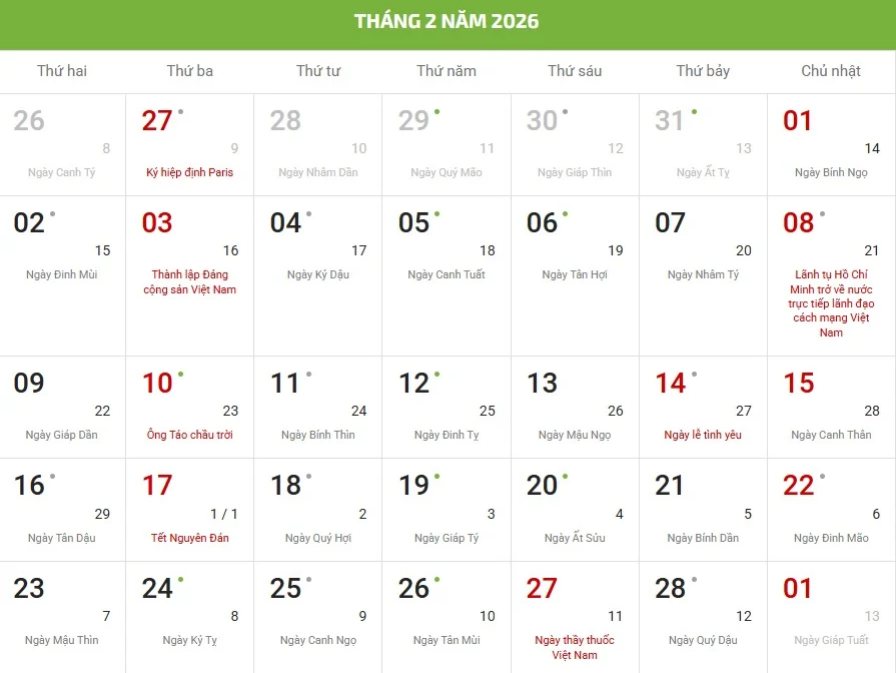 Theo Lịch Vạn niên 2026 - Lịch âm và dương 2026, Tết Âm lịch 2026 sẽ rơi vào các ngày sau:
