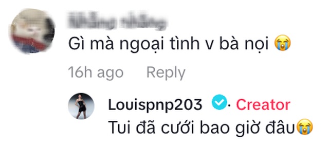 Giữa làn sóng bàn tán, Louis nhanh chóng có động thái phản hồi. Khi một cư dân mạng thắc mắc: "Gì mà ngoại tình vậy Louis?", cô đáp lại thẳng thắn: "Tôi đã cưới bao giờ đâu".
