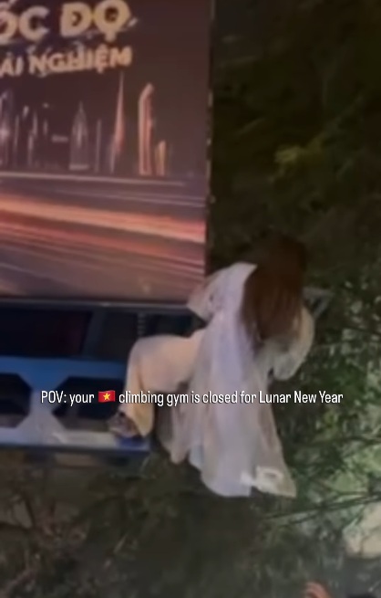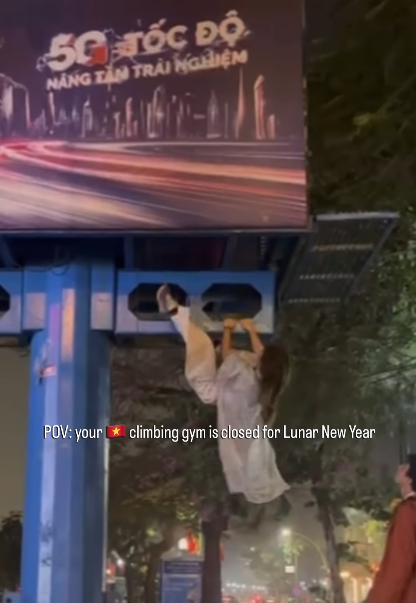 Tuy nhiên dịp Tết này, cô nàng lại có một "nước đi" khiến không ít người bất ngờ: mặc áo dài truyền thống và leo trèo lên… biển quảng cáo giữa nơi công cộng. Trong đoạn clip, hot girl treo mình trên kết cấu của biển quảng cáo, bên dưới là đường phố, xe cộ qua lại. Hành động leo trèo này quả thực vô cùng nguy hiểm, khiến khung cảnh trở nên phản cảm và gây sốc trong mắt người xem.