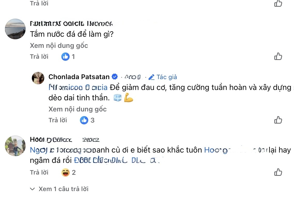 Mỹ nhân người Thái chia sẻ rằng mục đích chính của việc ngâm bồn nước đá là để giảm đau cơ và rèn luyện sự dẻo dai của tinh thần. Cô không ngại giải thích rằng đây là một phương pháp trị liệu khoa học (Ice Bath) giúp hồi phục cơ thể nhanh chóng sau những giờ làm việc cường độ cao hoặc tập luyện vất vả. Cô khẳng định việc vượt qua nỗi sợ hãi cái lạnh để ngâm mình là cách cô rèn luyện một "tinh thần thép".