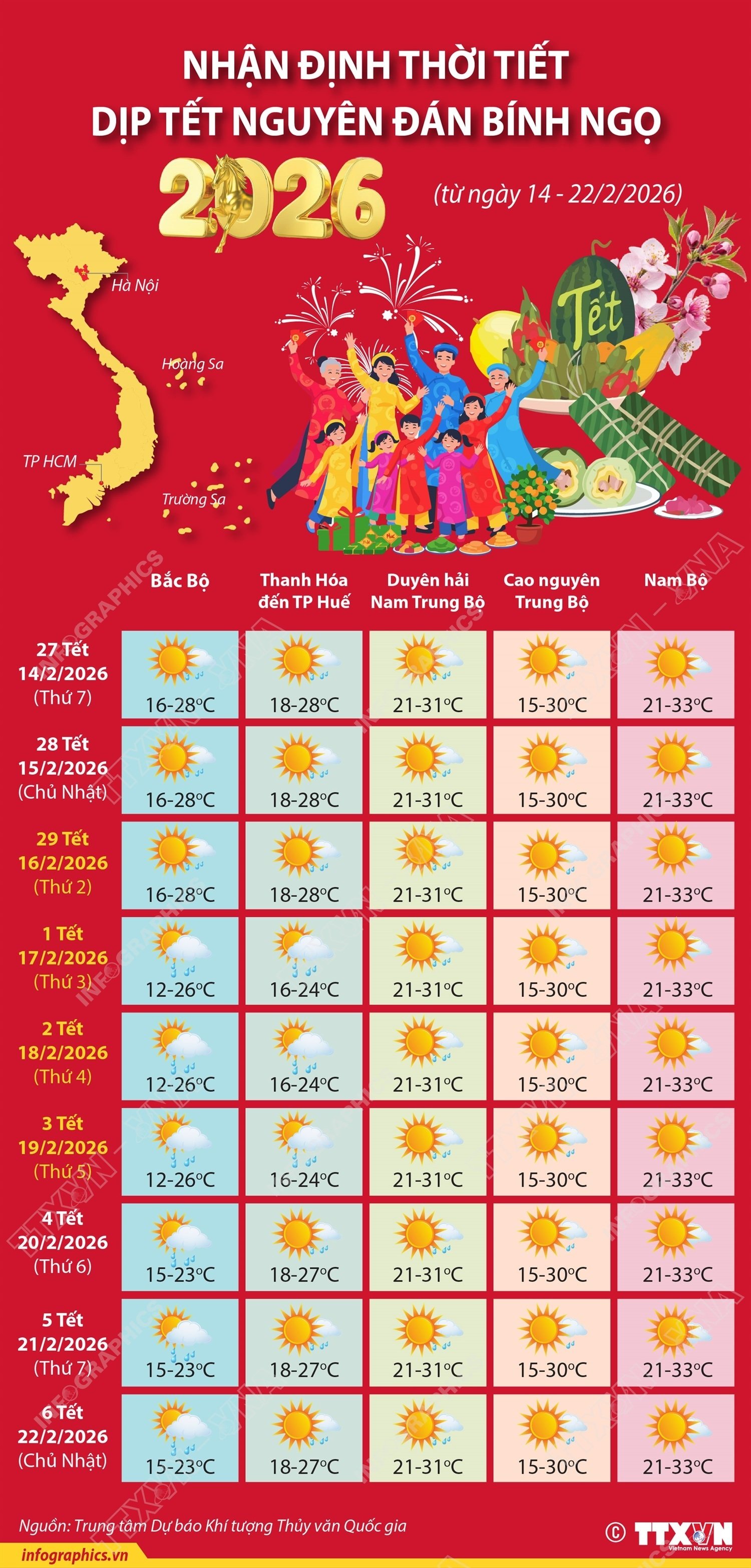 Theo Trung tâm Dự báo Khí tượng thủy văn quốc gia, dự báo thời tiết cả nước dip Tết Bính Ngọ 2026 khá thuận lợi để người dân và du khách mua sắm, du Xuân. Khu vực Bắc Bộ, Thanh Hóa đến Huế có mưa nhỏ vài nơi, trời rét. Khu vực duyên hải Nam Trung Bộ, cao nguyên Trung Bộ và Nam Bộ trời nắng, nhiệt độ cao nhất 33 độ.