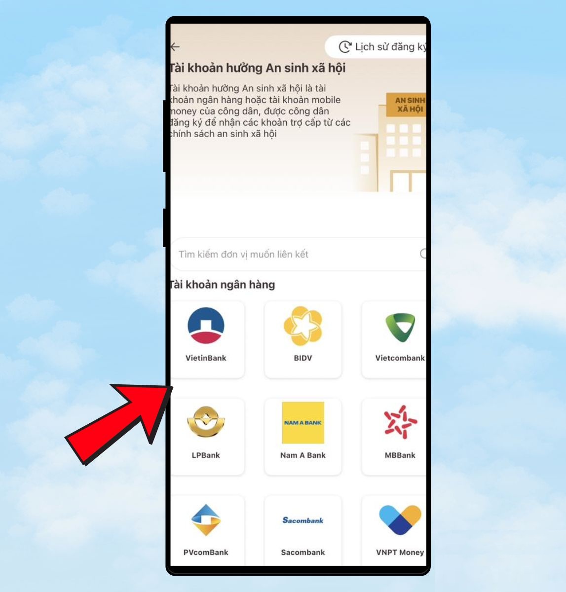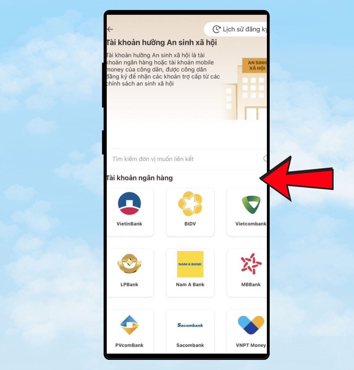 Sau khi xác thực xong, bạn chọn ngân hàng mà mình muốn nhận trợ cấp. Hiện tại, VNeID hỗ trợ ngân hàng gồm: Vietcombank, VietinBank và BIDV,...