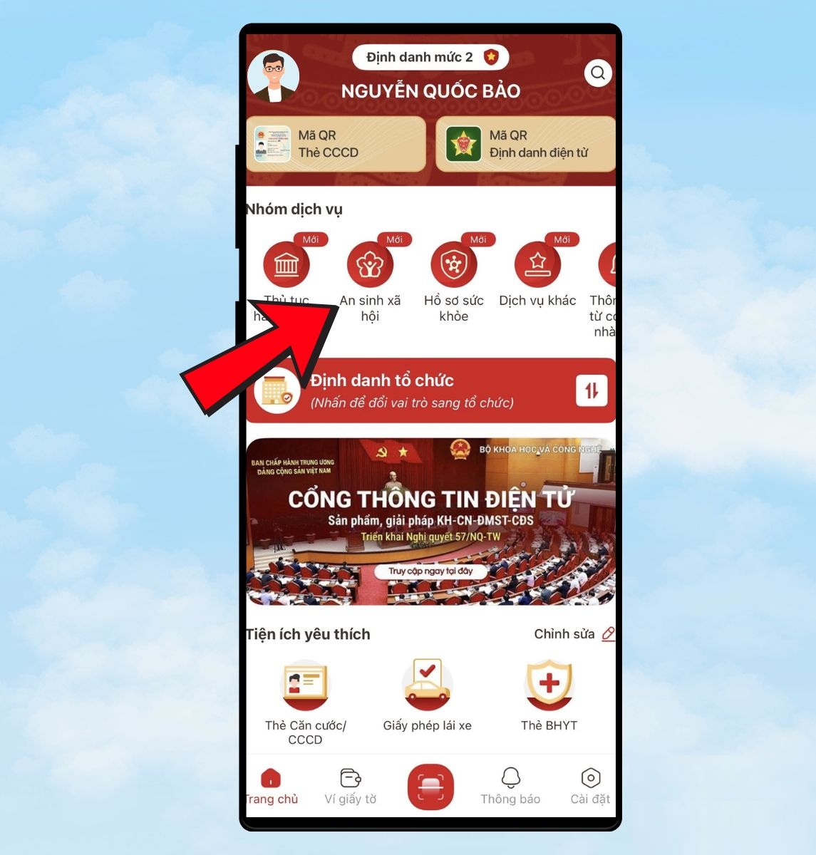 Ở màn hình chính của VNeID, bạn sẽ thấy nhiều tính năng khác nhau. Hãy chọn mục An sinh xã hội để tiếp tục làm thủ tục nhận tiền.