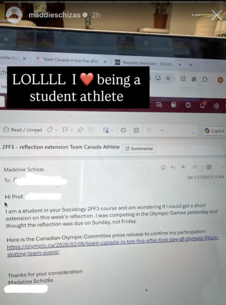 Mải thi đấu Olympic 2026 dẫn đến nhầm lẫn hạn nộp bài tập, VĐV Madeline Schizas của Canada phải gửi email xin giáo sư cho nộp bài muộn.