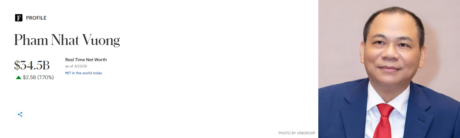 Theo dữ liệu thời gian thực của Forbes sáng 23/4, Chủ tịch Vingroup đang sở hữu khối tài sản khoảng 33,9 tỷ USD, tăng thêm 1,8 tỷ USD chỉ trong thời gian ngắn, qua đó vươn lên vị trí thứ 67 thế giới.