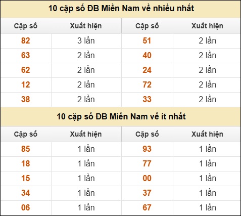 ⚡ 10 cặp số ĐB Miền Nam về nhiều nhất/ ít nhất tính đến ngày 05/10/2025: