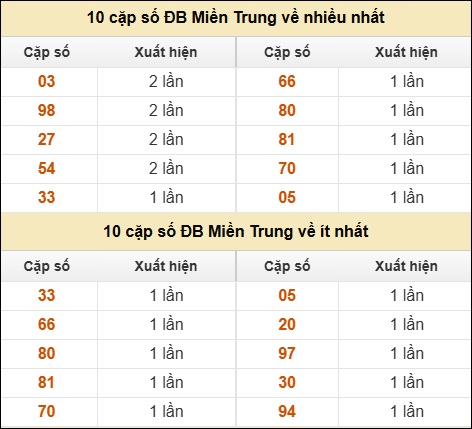 ⚡ 10 cặp số ĐB XSMT về nhiều nhất/ ít nhất tính dến ngày 06/10/2025: