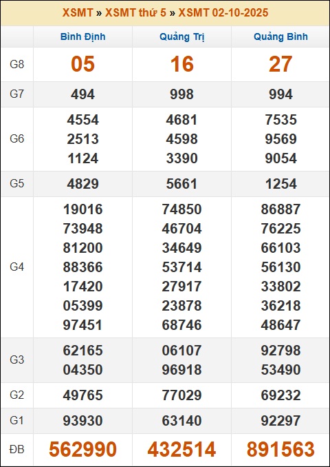 Thống kê XSMT 9/10/2025 - Phân tích kết quả xổ số Miền Trung Thứ 5 ngày 9 tháng 10 năm 2025 gồm 3 đài: Bình Định - Quảng Trị - Quảng Bình chi tiết nhất. Nhận định XSMT hôm nay 9/10/2025 miễn phí.